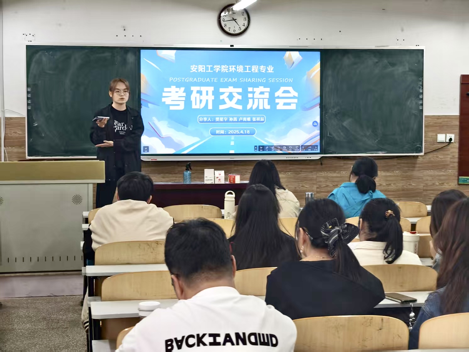 2025年4月18日17时,安阳工学院91丨国产丨精品入口环境工程2022级1班主动邀请2021级毕业生,在A01-504举办“研路同行”考研经验交流会。本次活动旨在搭建跨年级交流平台,通过优秀学长学姐的经验分享,为正在备战2026年考研的学子提供精准指导。4位第一志愿成功上岸的大四学子受邀主讲,40余名大三学生参与互动,现场气氛热烈。