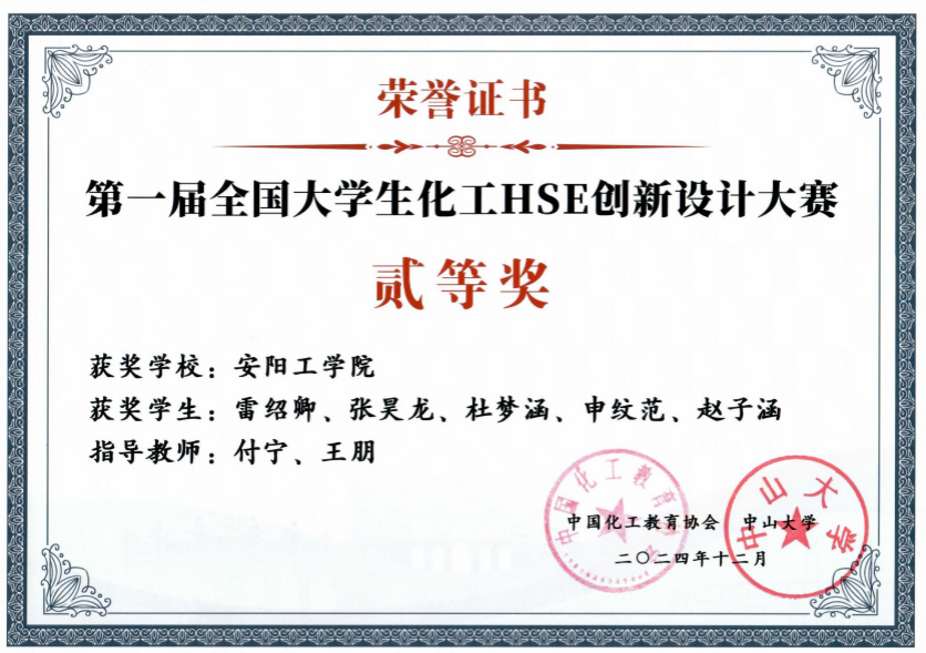 2024年12月20日至22日,中国化工教育协会主办的“第一届全国大学生化工HSE创新设计大赛”决赛在中山大学珠海校区举行。我院应用化学专业雷绍卿、张昊龙和化学工程与工艺专业杜梦涵、申纹范、赵子涵五位学生组成的“从容面队”队喜获贰等奖。学生准备和参赛过程由我院付宁和王朋老师指导。